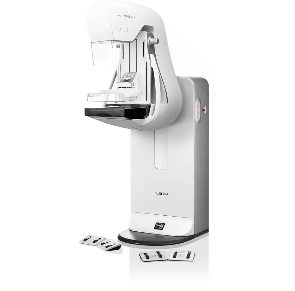 Digital mammography system that produces high-resolution images with low X-ray dose, Dual mode Tomosynthesis, and comfort functions.